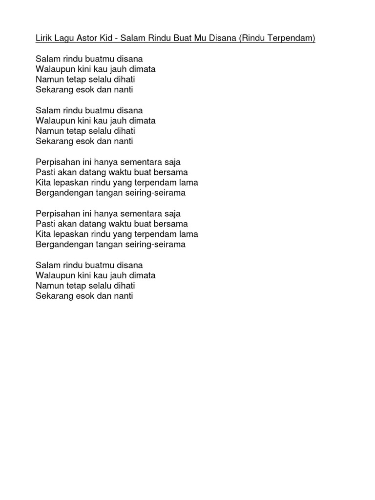Lirik Lagu Salam Rindu Buat Mu Disana - Astor Kid Klik disini untuk informasi terbaru seputar Lirik lagu chord kunci gitar foto wallpaper album baru berita musik dan lain - lain. Regita Echa 4170152 Play Download Lirik Rindu Terpendam - Astor Kids Versi Animasi Salam Rindu Buatmu Disana by. G C E walaupun kini kau jauh dimata.