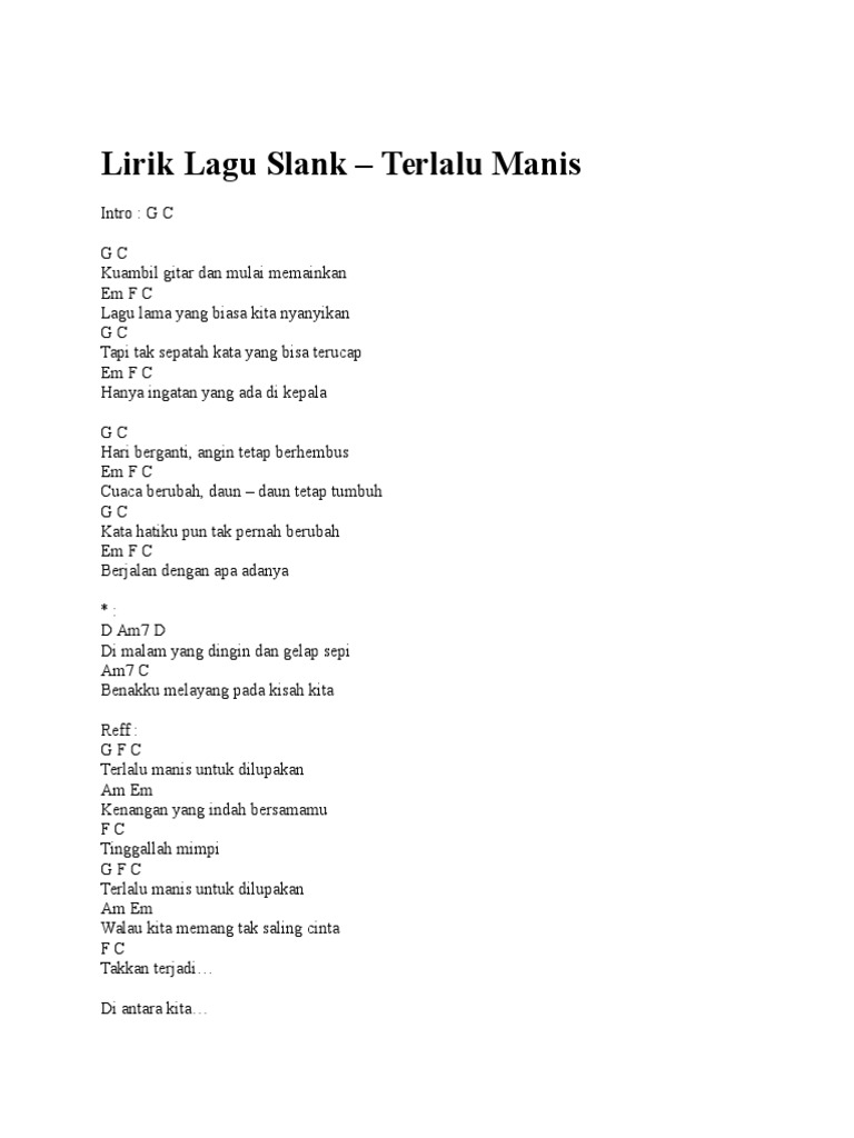 Chord Gitar Slank - Terlalu Manis untuk Dilupakan dari Kunci G Berikut ini chord gitar dan lirik lagu Terlalu Manis yang dipopulerkan grub band Slank. Chord Gitar Slank - Terlalu Manis untuk Dilupakan dari Kunci KOMENTAR. Terlalu manis untuk dilupakan Kenangan yang indah bersamamu tinggalah mimpi Terlalu manis untuk dilupakan Walau kita memang tak.